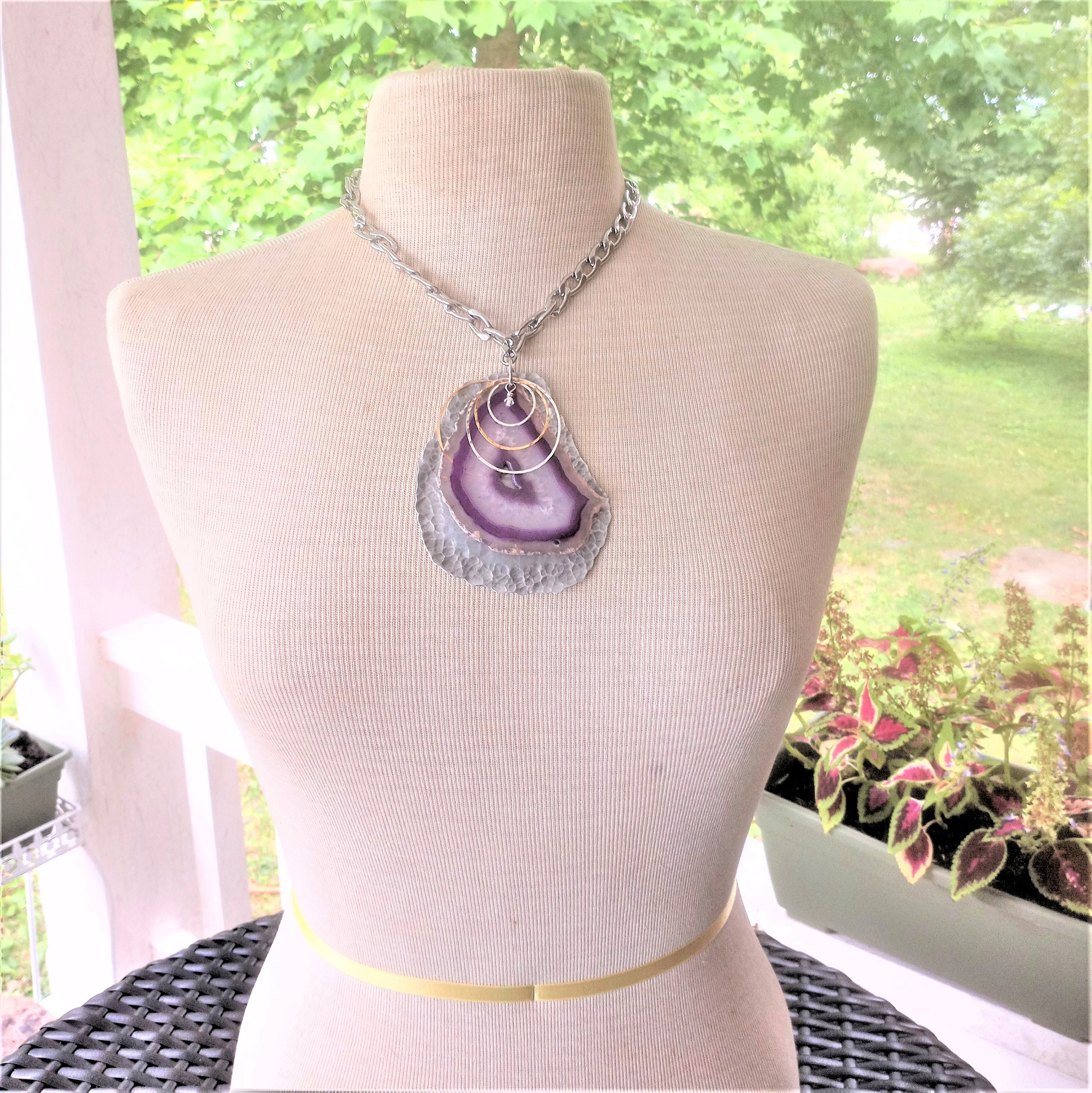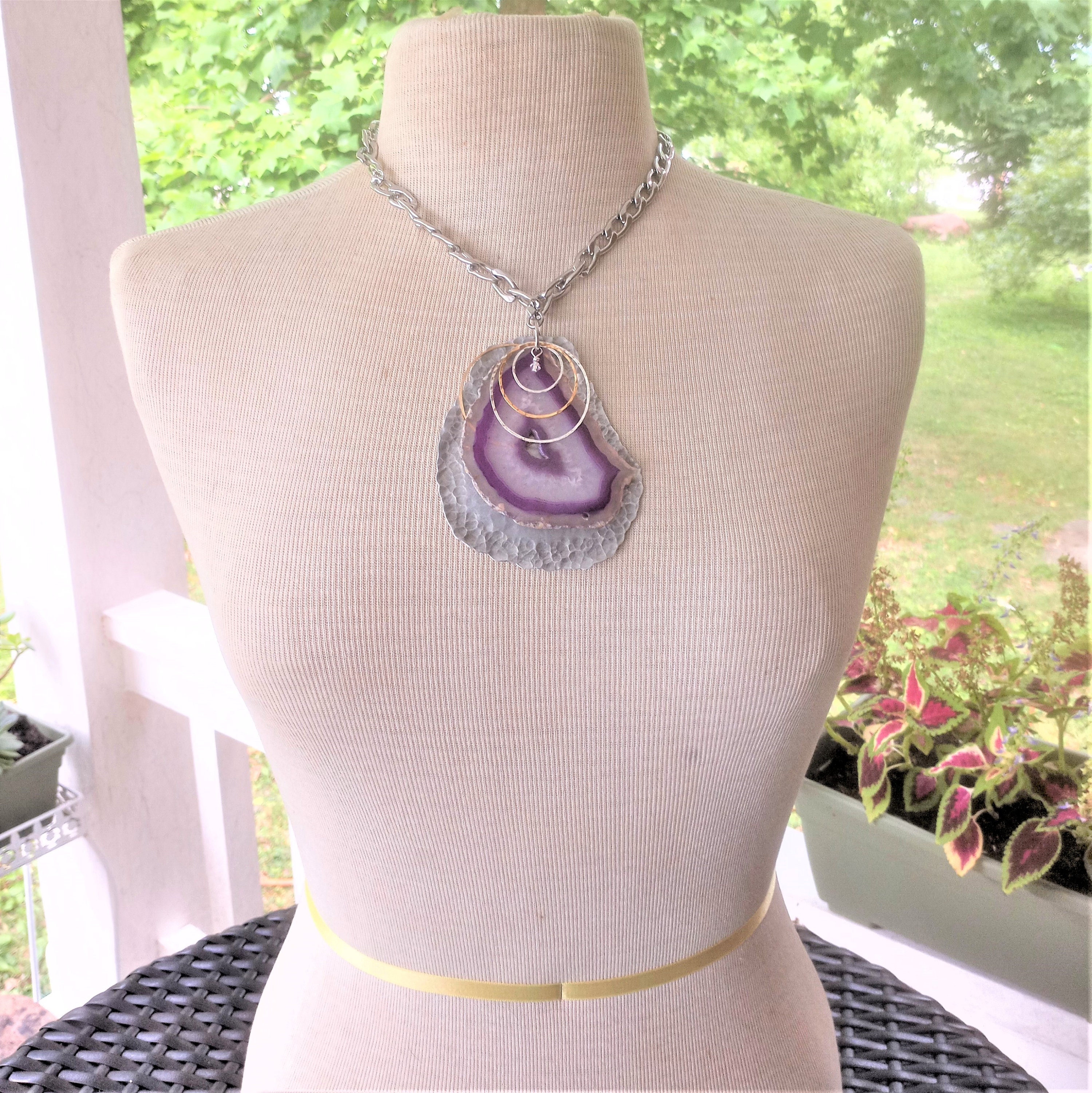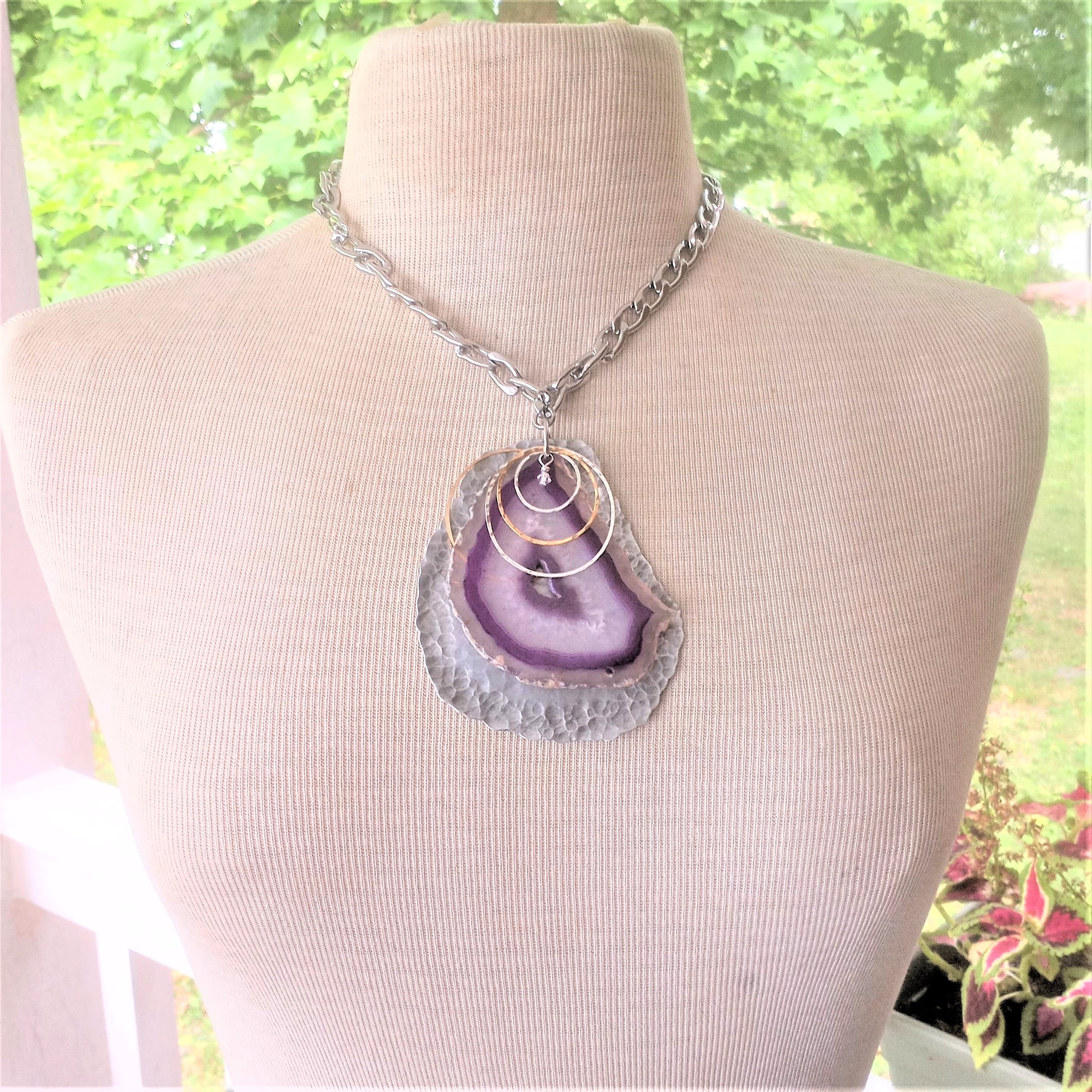 Freeform slice of purple agate with hammered silver and gold jangles and Swarovski crystal accents on hammered aluminum pendant. Chain is stainless steel. Chain is 18" long. Pendant is 4" long. One of a kind and signed.