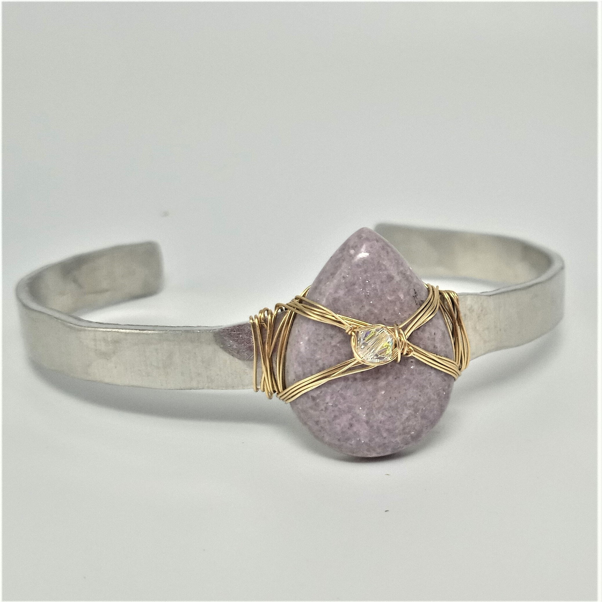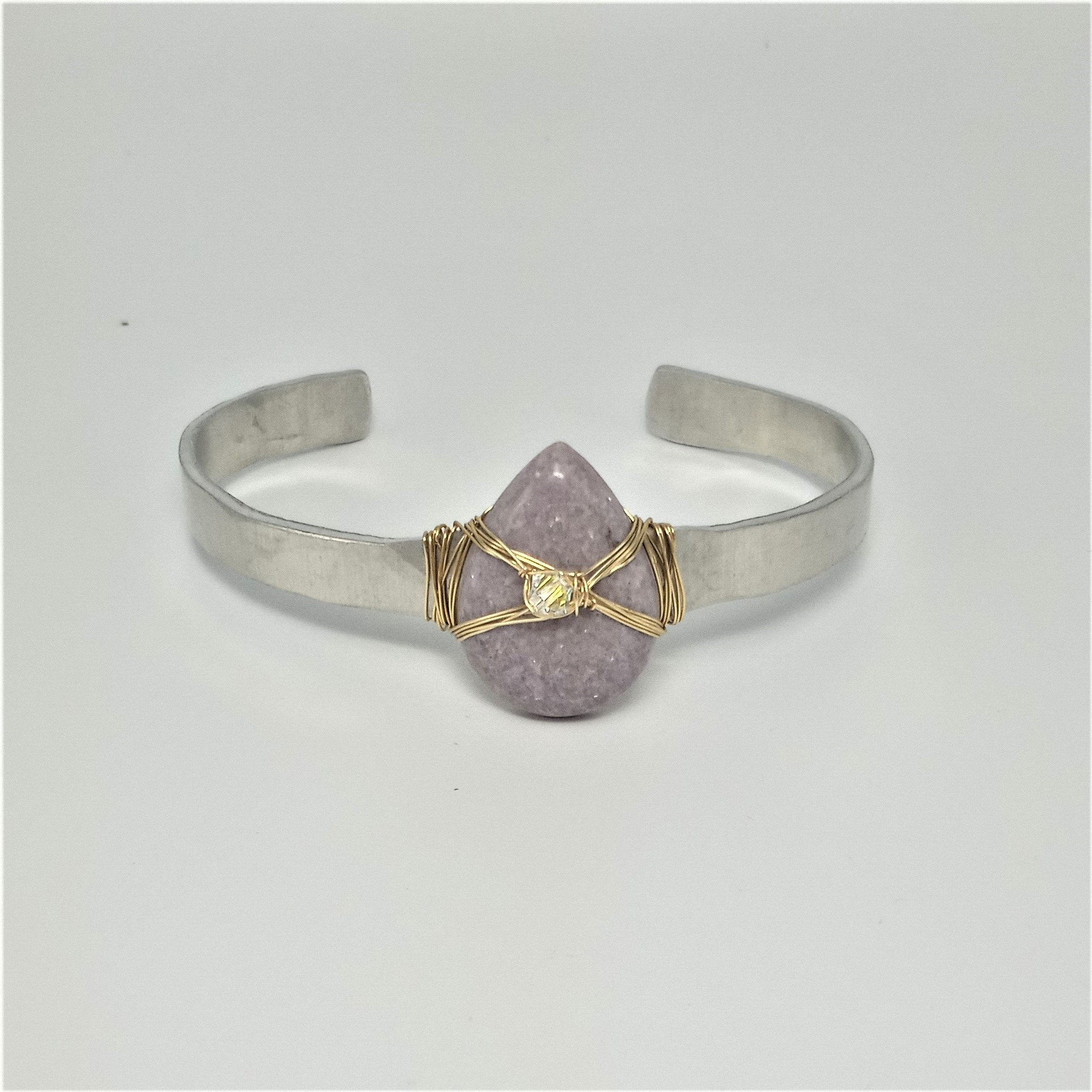 Purple lepidolite gemstone lightly wrapped with gold fill wire and Swarovski crystal accent on hand cut, shaped, hammered .25" wide aluminum cuff bracelet.