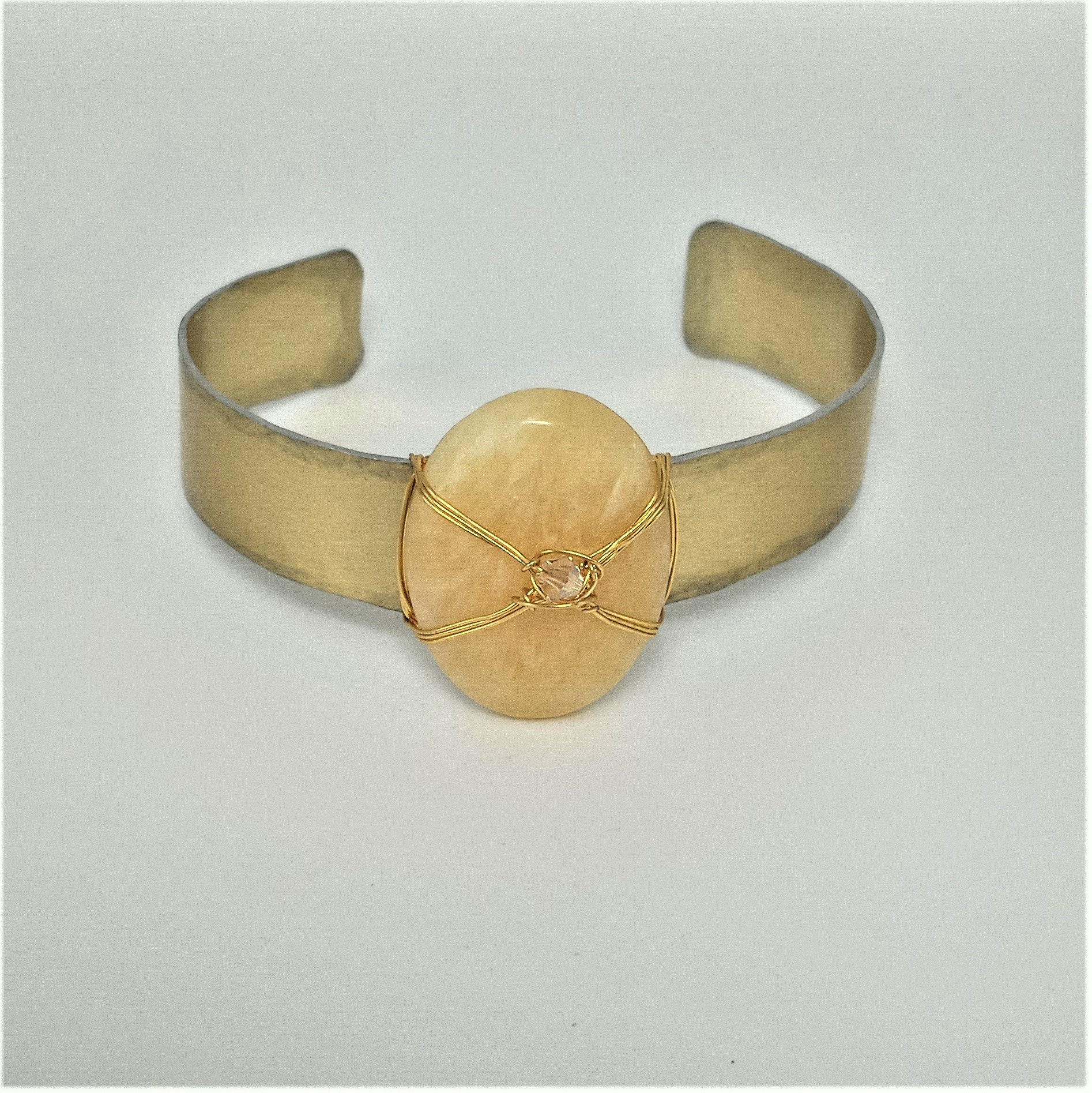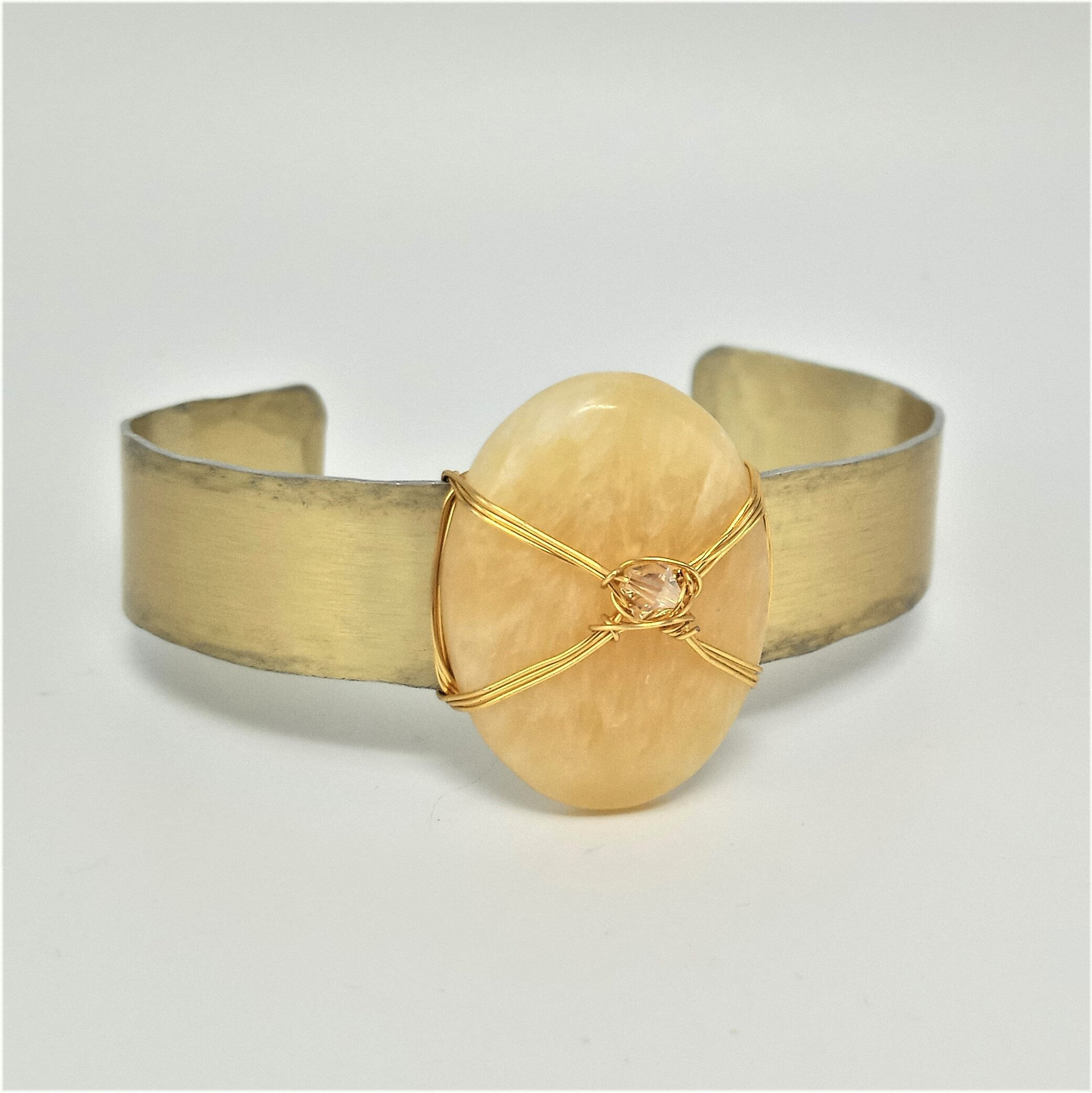 Milky golden calcite lightly wrapped in gold fill wire with Swarovski crystal accent on hand cut, hammered, sanded, waxed anodized golden aluminum. Moldable to fit wrist sizes 7-10 One of a kind and signed.