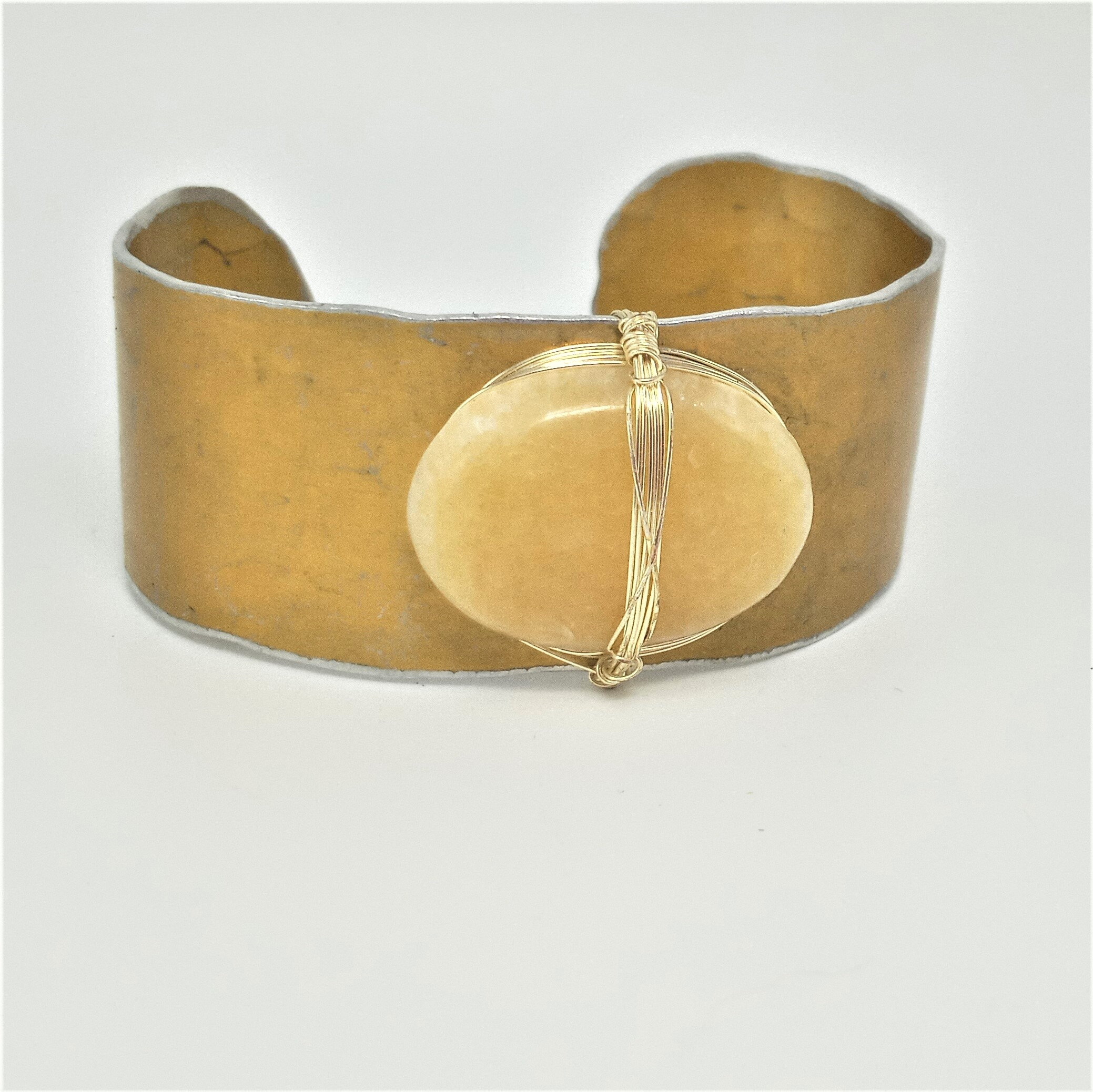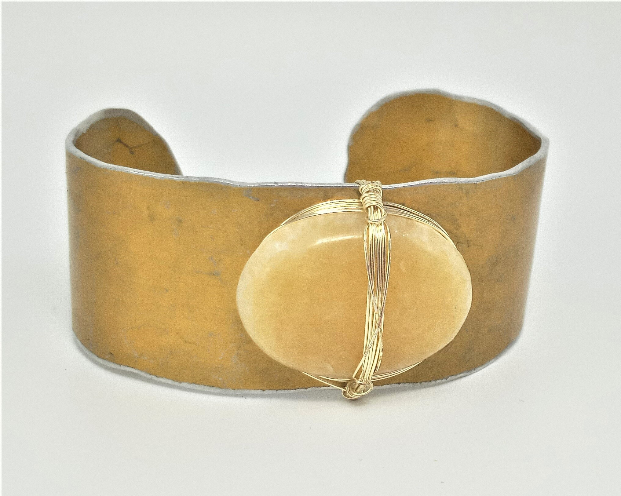 Milky golden calcite lightly wrapped in sterling silver wire with Swarovski crystal accent on hand cut, hammered, sanded, waxed anodized golden aluminum. Moldable to fit wrist sizes 7-10 One of a kind and signed.