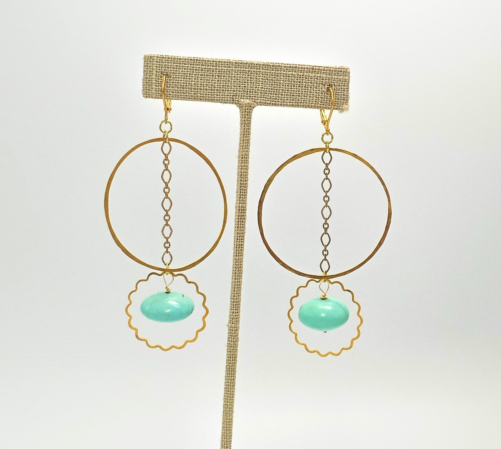 Gorgeous light blue Tibetan turquoise, brass and gold fill metal work, gold fill lever back earring. 2.5" long lightweight One of a kind