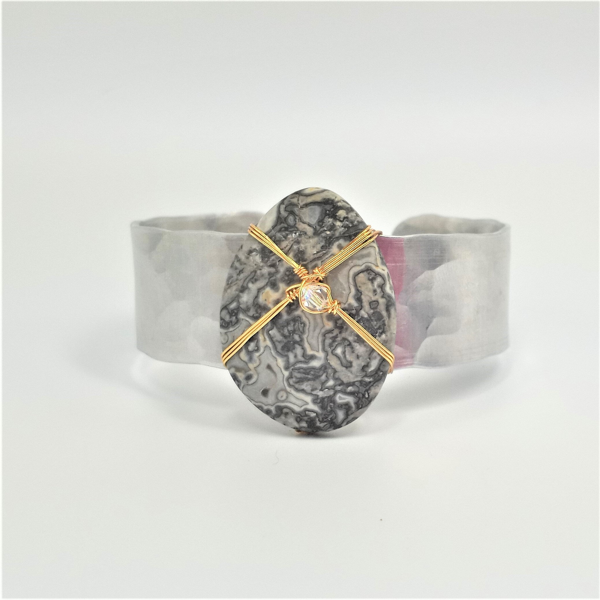 Shade of gray crazy lace agate lightlty wrapped with gold fill wire and Swarovski crystal accent on hand cut, shaped, sanded, hammered, textured, waxed 1" wide aluminum cuff bracelet. One of a kind and signed.