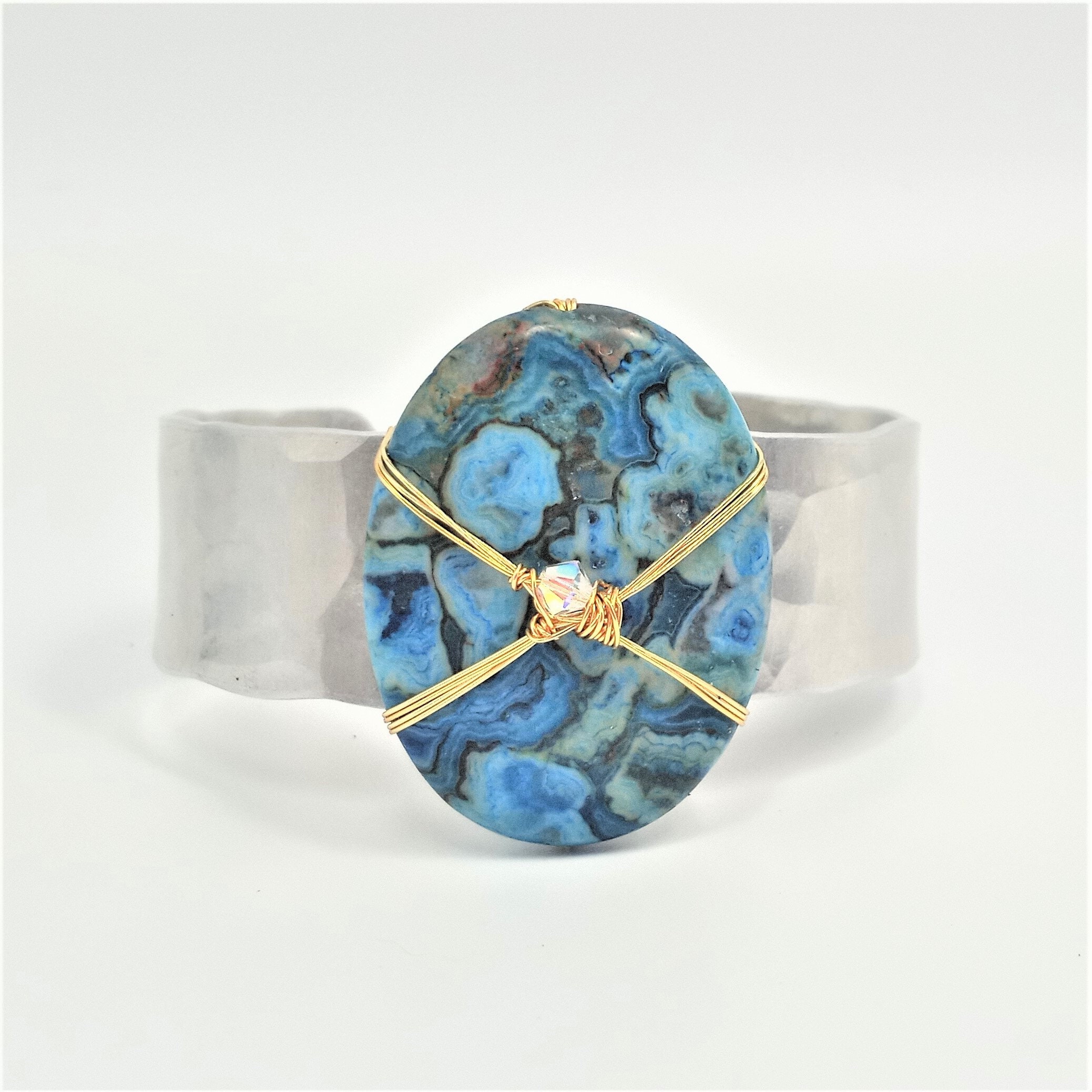 Ocean blue crazy lace agate lightly wrapped with 14k gold fill wire and Swarovski crystal accent on 1" wide hammered, textured aluminum cuff.