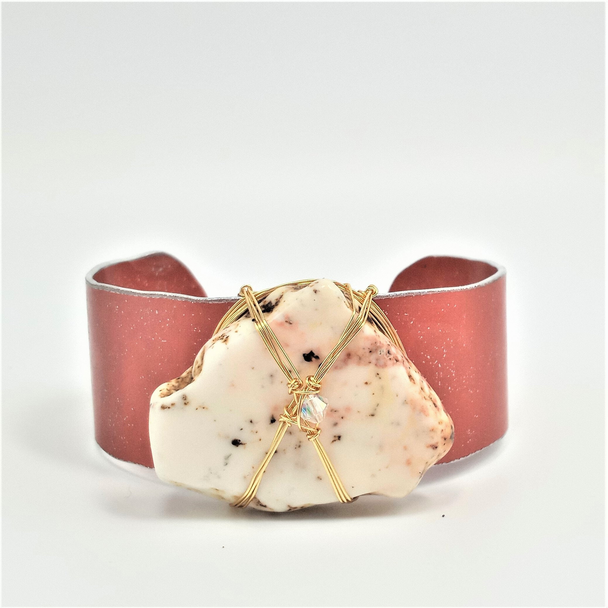 White turquoise lightlty wrapped with gold fill wire and Swarovski crystal accent on hand cut, shaped, sanded, hammered, textured, anodized coral aluminum,, waxed 1" wide cuff bracelet. One of a kind and signed.