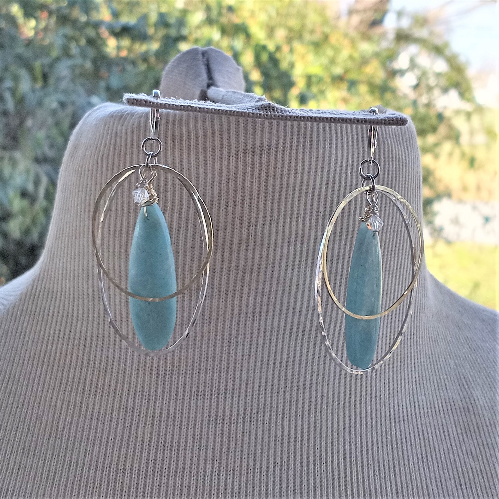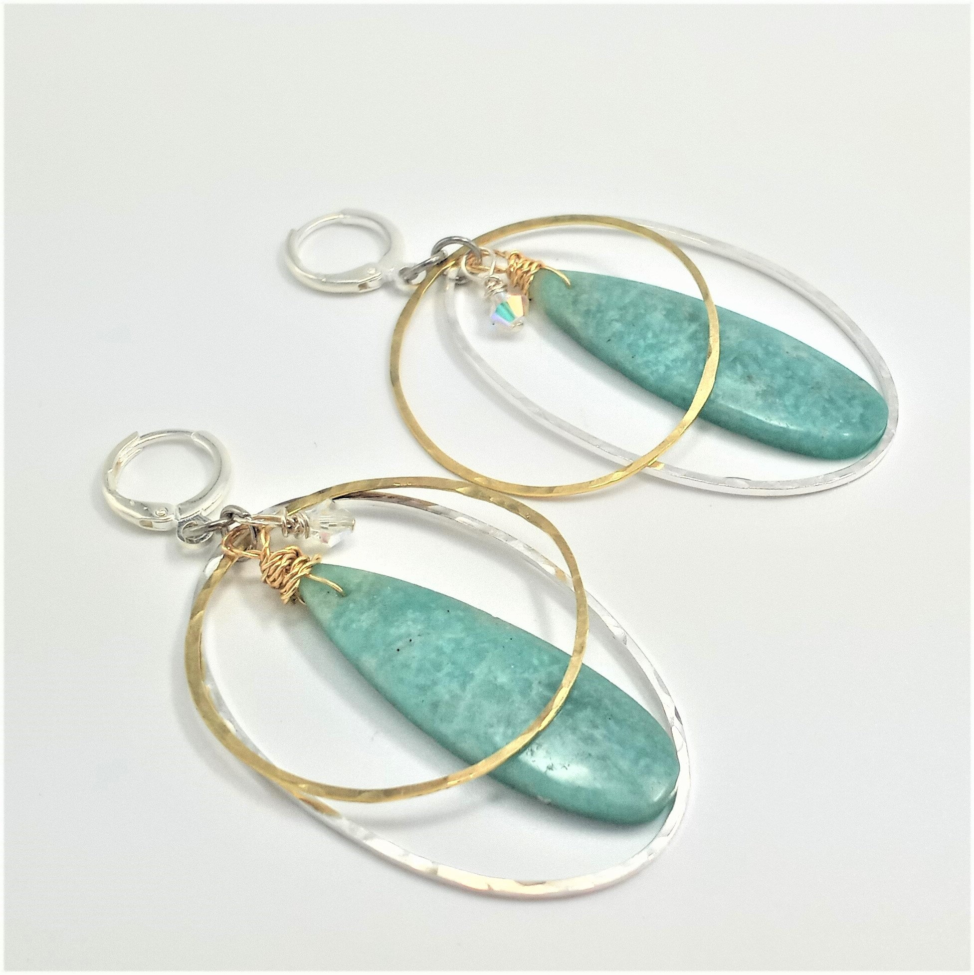 Amazonite lightlty wrapped with gold fill wire on hand cut, shaped, sanded, hammered, textured, waxed silver, gold filled dangles. Approx 2" long.