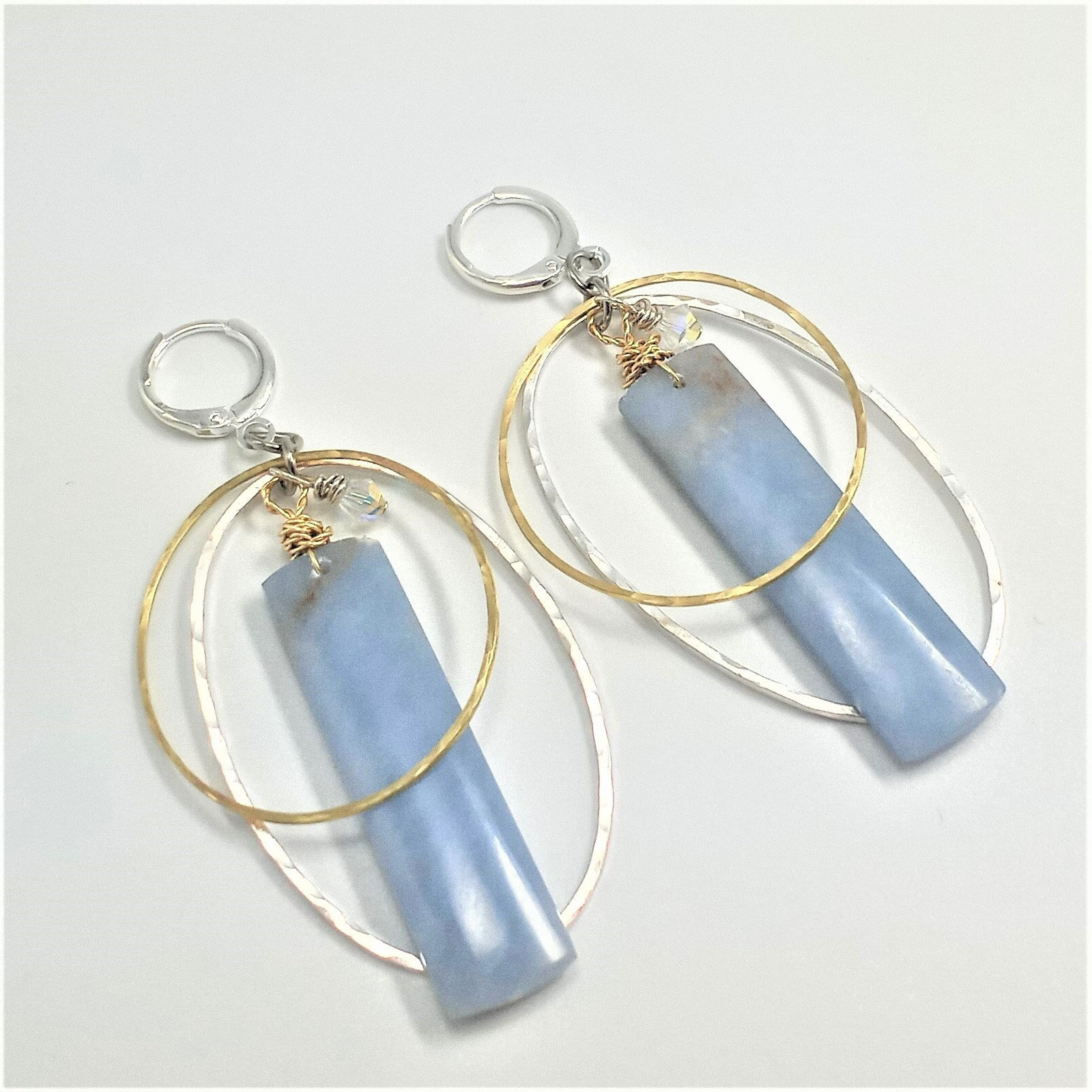 Soft and subtle light blue natural angelite lightlty wrapped with gold fill wire on hand cut, shaped, sanded, hammered, textured, waxed silver and brass. 2" long.