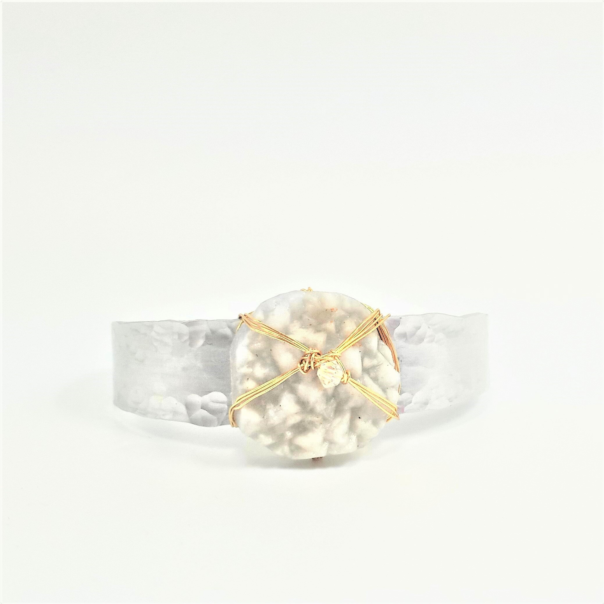 Blue lace agate druzy lightlty wrapped with gold fill wire and crystal accent on hand cut, shaped, sanded, hammered, textured, waxed .50" wide tapered aluminum cuff bracelet. One of a kind and signed.