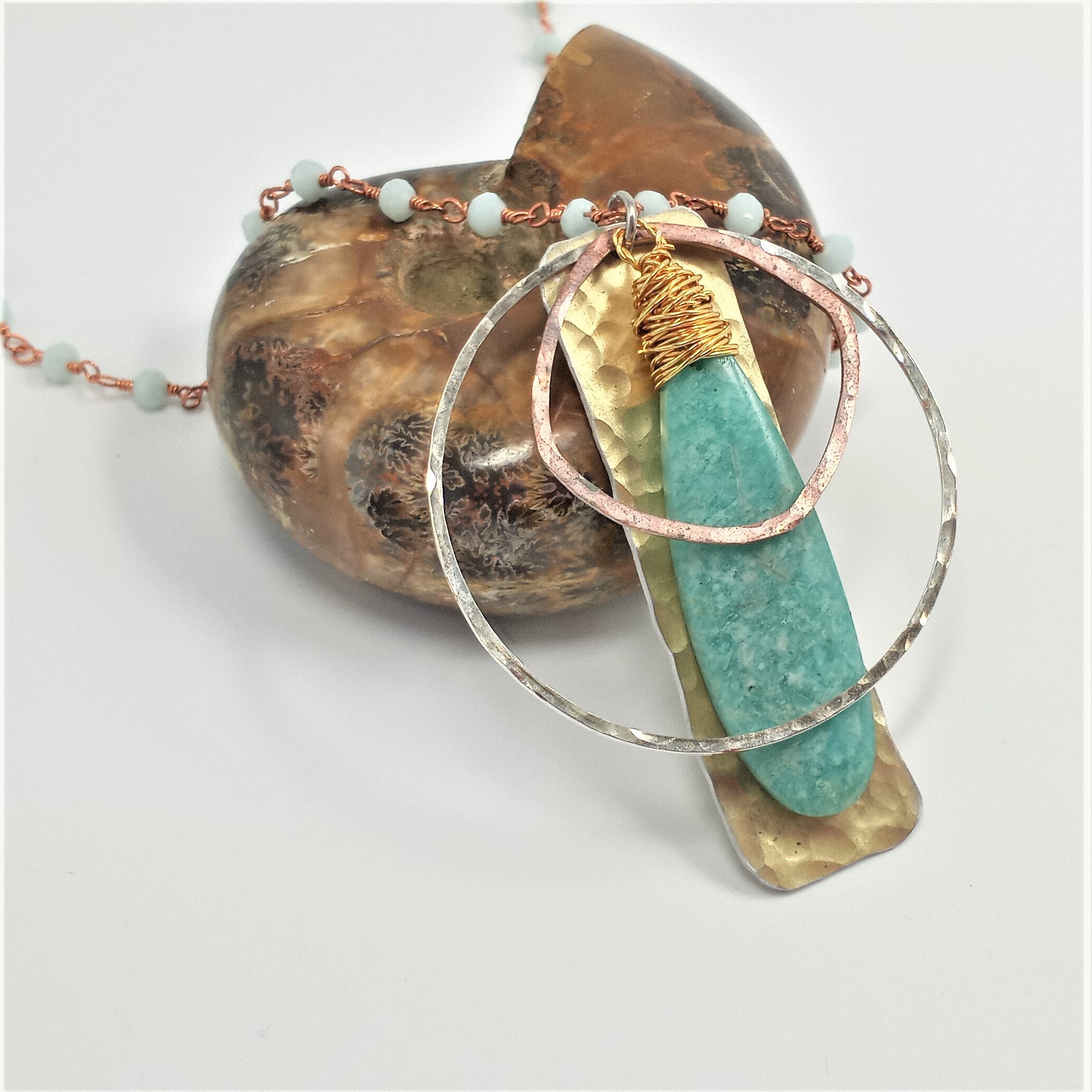 Amazonite lightlty wrapped with gold fill wire on hand cut, shaped, sanded, hammered, textured, waxed golden aluminum and silver, rose gold filled dangles on amazonite rose gold chain. Necklace 18" long Pendant 2" long.